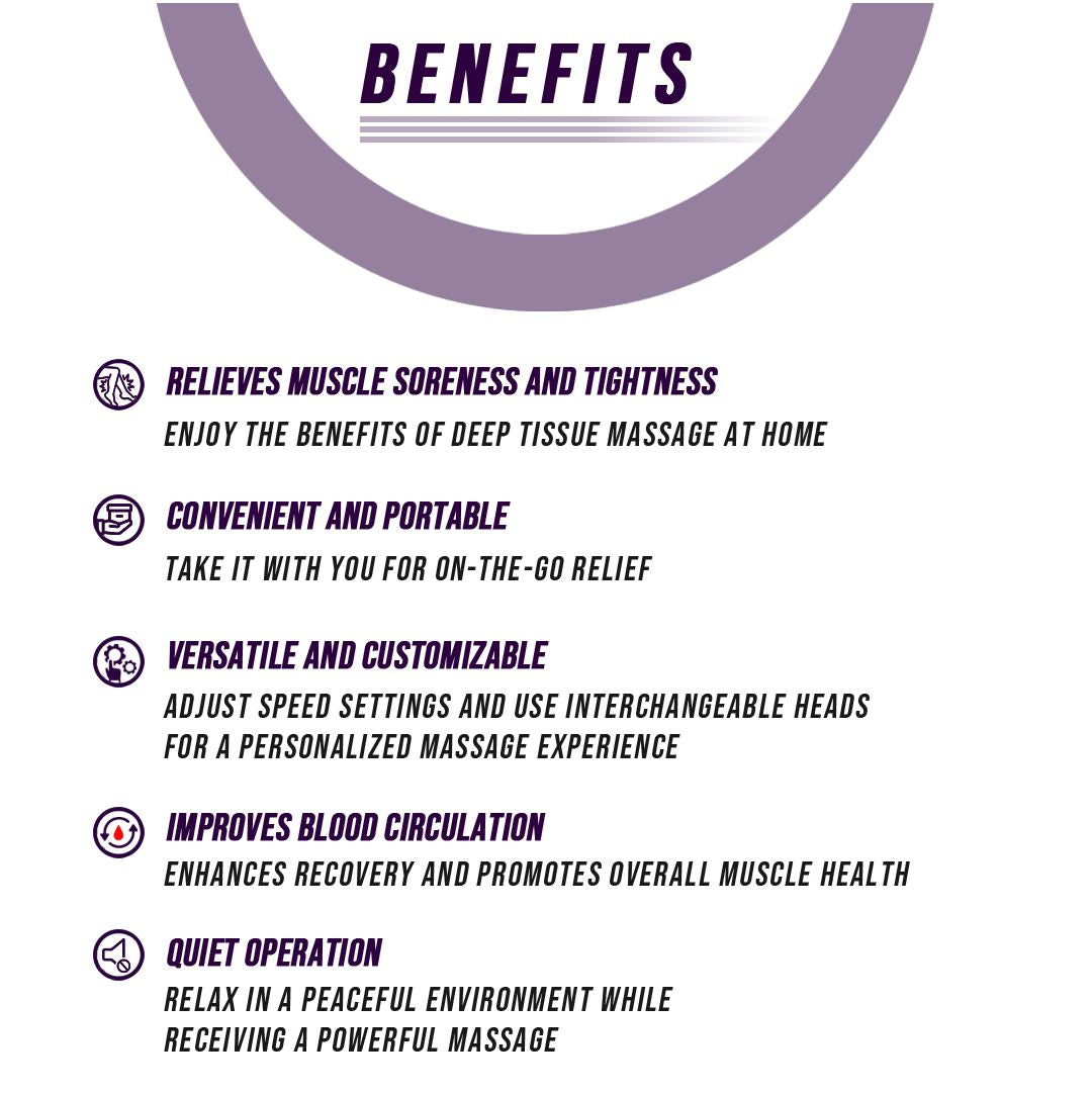 Whether you're recovering from an intense workout or just need to relieve everyday tension, this massage gun enhances blood circulation, reduces muscle stiffness, and accelerates recovery for faster relief. Its compact and portable design makes it perfect for use at home, the gym, or on the go, ensuring you can enjoy a soothing massage wherever you are.